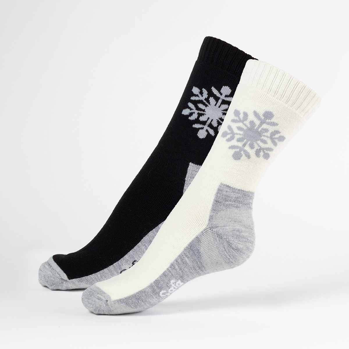 Deilige ullfrottèsokker i 2-pars pakning med snøfnugg motiv. Merinoullen føles myk og behagelig mot huden og puster godt. Den transporterer svette og fukt, og er naturlig lukthemmende.